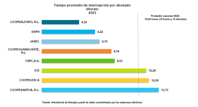 El tiempo promedio de interrupción por abonado fue de 10 horas y 15 minutos, valor superior al de 2022 donde registró 8 horas y 22 minutos. Por esto, la ARESEP exigirá a las empresas eléctricas planes de acción para