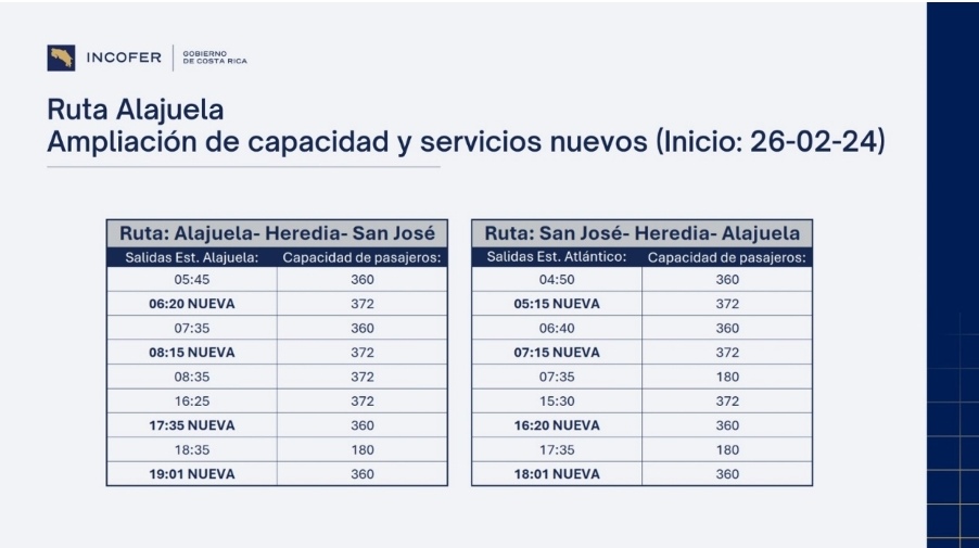 El Instituto Costarricense de Ferrocarriles (INCOFER) informó que la ruta Alajuela-Heredia-San José ha presentado un aumento de 1098 pasajeros, esto tras la implementación de nuevos horarios en el servicio.