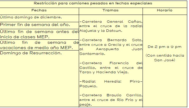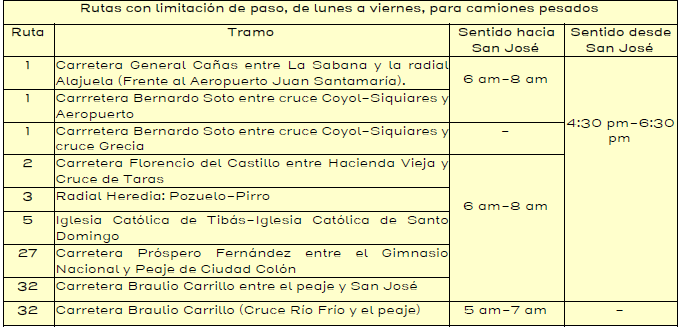 Los camiones pesados no podrán trasladarse en la carretera General Cañas, así como en la ruta Florencio del Castillo con sentido hacia San José en la mañana y en la tarde en el sentido contrario, además, la ruta 32, la radial de Heredia y la ruta 5 entre Santo Domingo y Tibás también aplicarán dichas medidas de restricción.