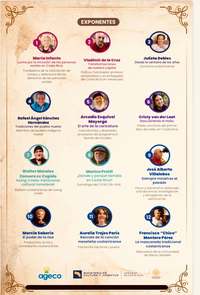 -Disfrute de una velada memorable con información, música, narraciones, humor y vivencias que compartirán con personajes como la escritora Julieta Dobles; el caricaturista Arcadio Esquivel, el bailarín de swing criollo Walter Zamora, el físico y astrónomo José Alberto Villalobos, la folclorista Aurelia Trejos y la actriz Marcia Saborío.