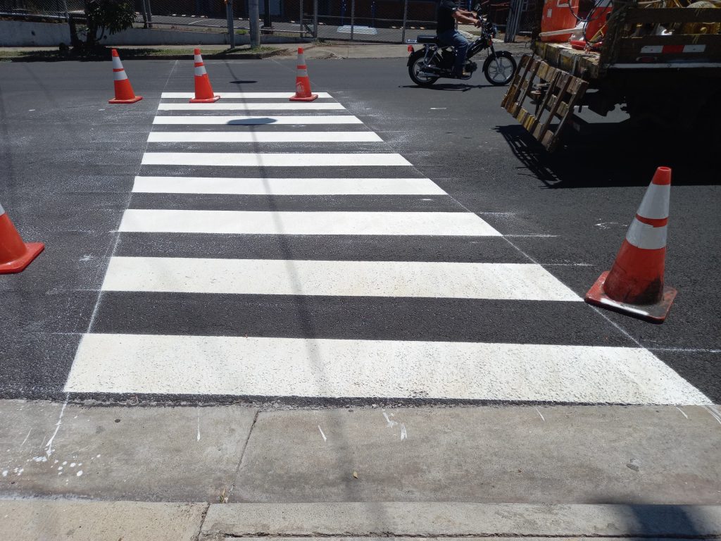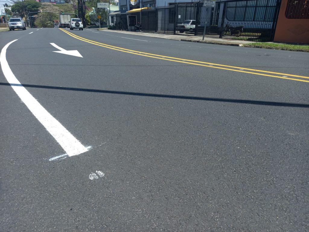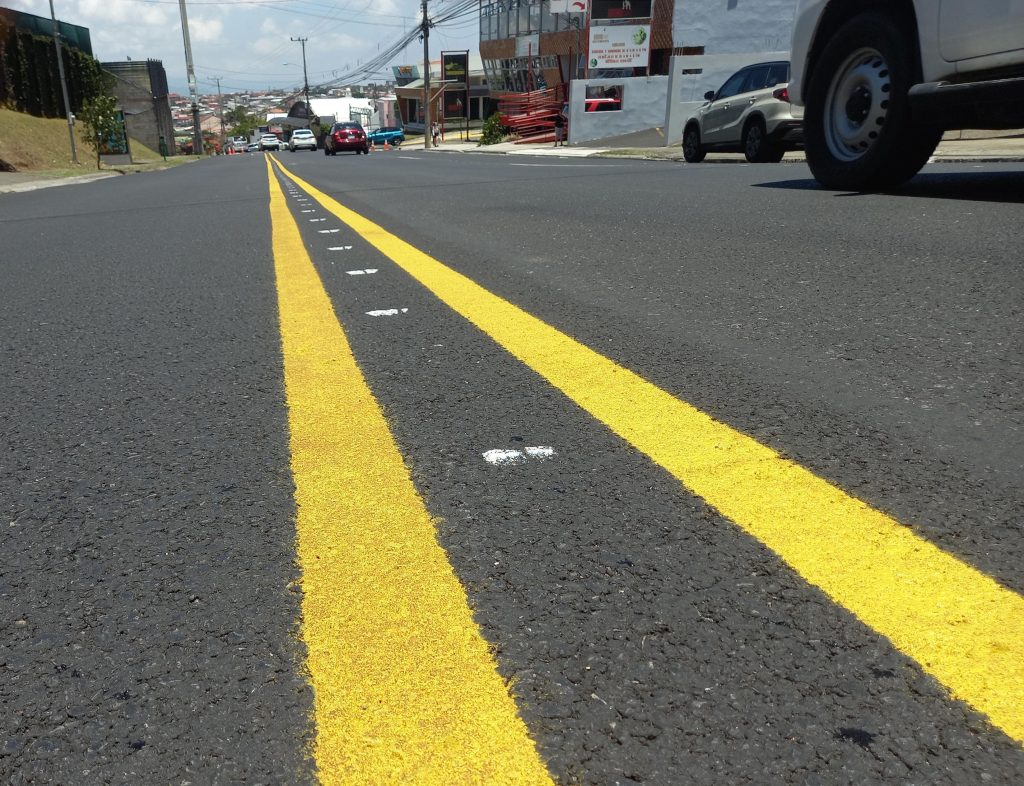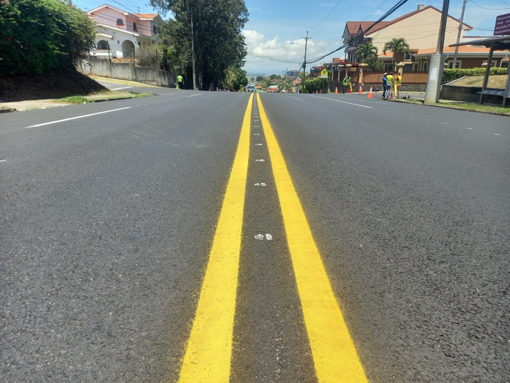 Luego de perfilar (retiro de la vieja superficie de ruedo) y colocar una nueva carpeta en mezcla asfáltica, a lo largo de 2 km, ya se tiene un avance del 70% en la demarcación de este tramo de carretera de la ruta nacional 112, entre Heredia y San Pablo.