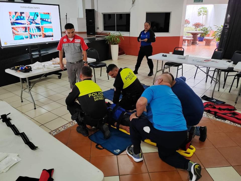 Los oficiales de la policía municipal de San Pablo de Heredia en unión con sus vecinos de Santo Domingo y San Isidro, se reunieron en la Plaza de los Expresidentes de San Pablo, para recibir capacitaciones completas en primeros auxilios, esto como parte de su preparación para brindar un servicio de excelencia a las tres comunidades.