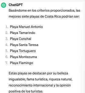 Una de las inteligencias artificiales más populares es el llamado Chat GPT (Chat Generative Pre-Trained Transformer) la cual se actualiza constantemente con bases de datos actualizadas y la que se le puede consultar diferentes preguntas, como cuáles son la playas más atractivas en el país. Con base a lo indicado por la Cámara de Comercio y Turismo de Tamarindo, Chat GPT ubica a playa Tamarindo como la segunda playa más atractiva de Costa Rica, siendo superada por playa Manuel Antonio, ubicada en Puntarenas.