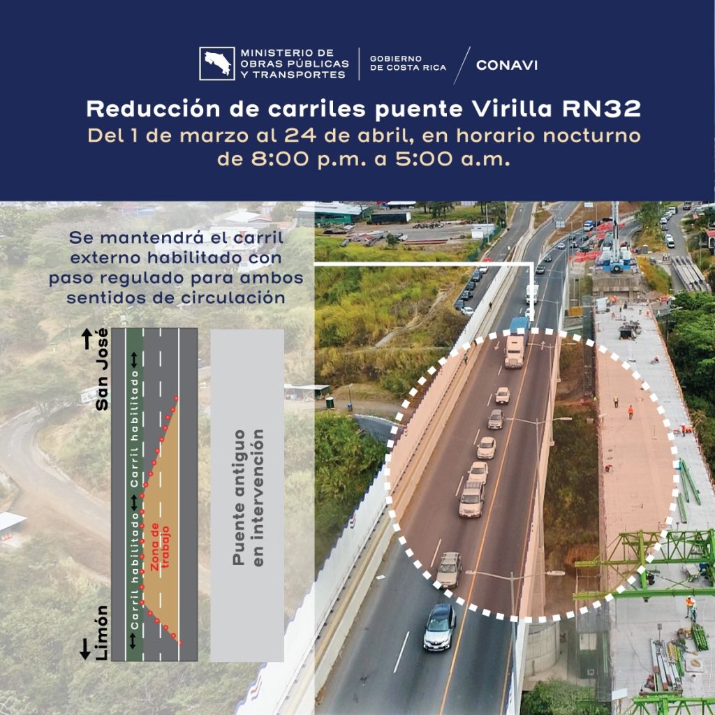 El Ministerio de Obras Públicas y Transportes (MOPT) que se efectuará la ampliación del tablero del puente ubicado en la Ruta Nacional 32, sobre el río Virilla, sin embargo, dichos trabajos se llevarán a cabo en un horario nocturno.